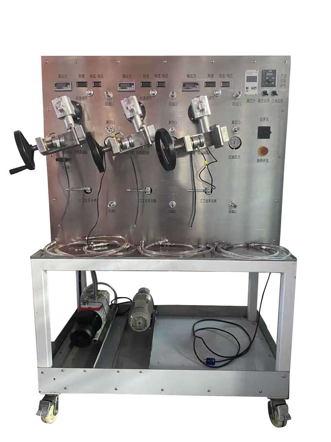 液压模块抽真空加注台采用进口高真空旋片泵稳定产生最低10Pa的真空环境,采用西门子变频磁力泵对产品抽真空的同时进行循环加注,同时在循环油路中设置两路高精度过滤器,可实现液压模块产品的高真空度清洁加注。